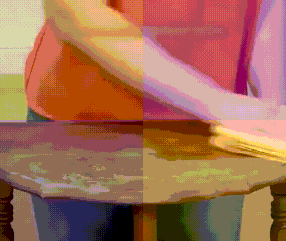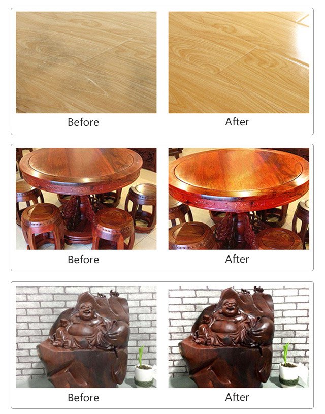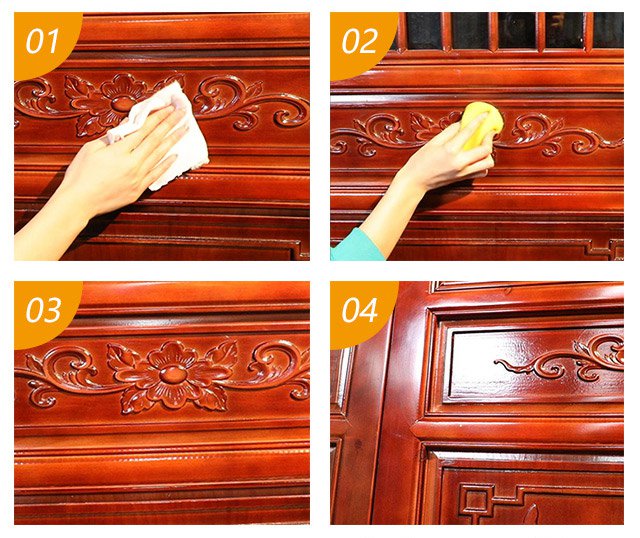 Nałóż trochę wosku, gwałtownie rozprowadź po powierzchni, aż wosk wyschnie i gotowe. Tylko 2 kroki, aby skutecznie zachować swoje meble, czas i pieniądze!